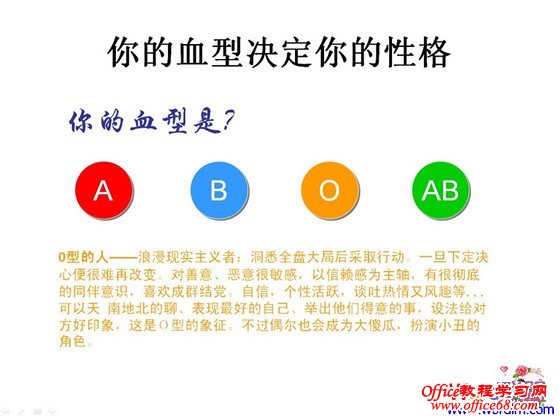 案例:在屏幕中首先出现画面,然后由学生选择任意一种血型,并显示出相关的结果。如图所示: