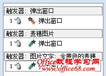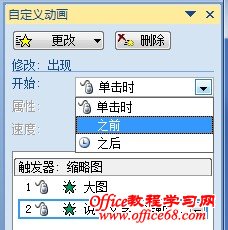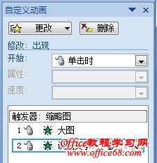 ⑥用同样的方法,为“说明文字”设置触发器,触发对象仍然选择“缩略图”。设置完成后,在“自定义动画”窗格中显示效果如下图,此时“触发器:缩略图”下有两个动画。