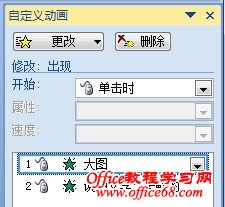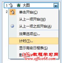 ④在“自定义动画”窗格中,点击“大图”动画右侧按钮,选择“计时”选项,弹出对话框。