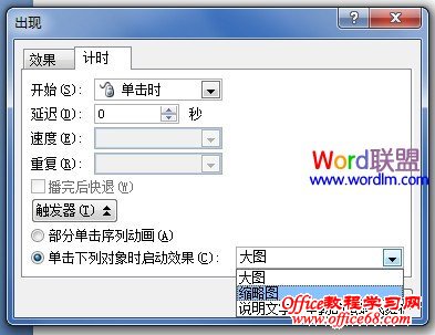 ⑤点击“触发器”按钮,选择“单击下列对象时启动效果”选项,点击右侧按钮,选择“缩略图”,点击确定。