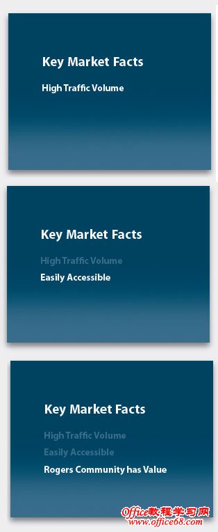 在上图中,主题“ KEY MARKET FACTS ”(主要市场因素)要突出显示,这样可以让观众记住你要谈的内容相互之间的关系。但我们要让每一个细点陆续出现,谈到哪一个才让它出现哪一点的标题。谈过的东西变暗,正在谈的东西突出(如上方为白色)。每一个要点仍然要符合简洁的要求。 风格要统一幻灯片的内容(特别是一些图案及图片元素)多种多样,但无论如何,我们都要使它们看起来协调统一,可以利用颜色重复、字体及版式统一起来。版面的各个主要空间分配要保持一致。