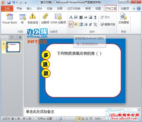 2 点击开发工具,控件里面的打钩小方框,在幻灯片上面添加。