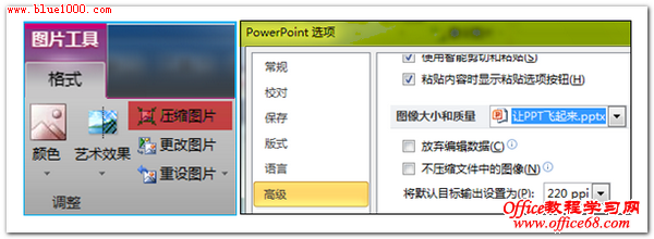 3 PowerPoint 2007/2010操作类似,单击图片会出现图片工具/格式选项卡→调整组→压缩图片。与PowerPoint不同的是,PowerPoint 2007/2010专门提供了对于图片压缩的设置,单击文件选项卡进入PowerPoint选项,选择高级选项——图像大小和质量,在这里可以对PPT图像的压缩保存进行相关设置。