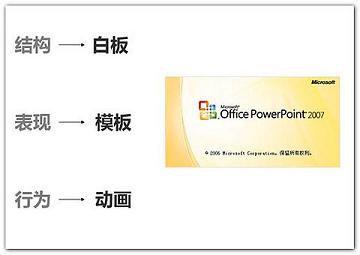 从字面很容易理解三个部分的概念和内容。自从标准被推广以来,我们可以观察到Web设计风格的转变,特别是内容和表现的分离,能够让整个网站迅速改变风格(更换皮肤)。而对于网页设计者来说,网站页面改版变得更加简单,只要改动CSS代码(表现)即可。 我们认为,Web标准同样可以应用在PPT设计中。