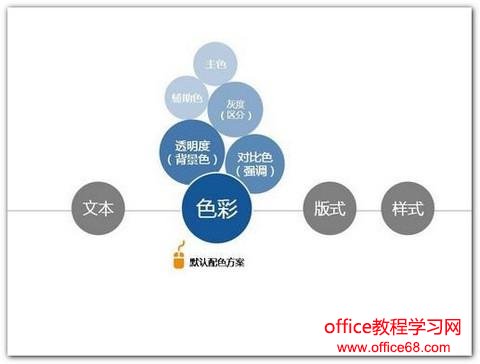 第二:色彩规范 色彩是我们感觉到最头疼的问题之一了,我们选用色彩的最初目的在于进行“区分”,让其看上去不同或体现 重点,但对色彩选择的随机性,造成了内容的花俏,凌乱。PPT中包含的配色方案(03有8种,07/10有12种)可以规定页面中经常使用的色彩,配色方案就像blog的皮肤 一样,可以通过修改实现全文档快速替换。 当然,色彩的选择和搭配就需要涉及一部分平面设计的基础,在今后的专题中会具体讲到。