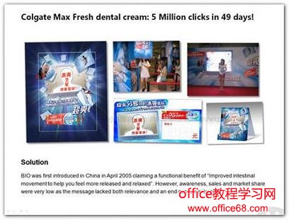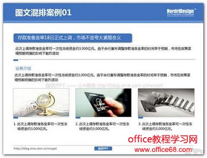 整体步骤如同案例1,加入了线条来区分页面右侧的文本区域,我们强调点、线、面的有序结合,如果以图 片(面)文字(点)过于规矩的排列于页面中,不如加入点线条来更好的协调画面。 非常规图文无序混排 总会遇到一些内容轻松、类型活泼的PPT,或是在一些需要创意执行的作业中,我们不希望循规蹈矩的将图片 有序的排列在一起,下面分享的则是“有违常规”的图片摆放效果。 图文混排案例3