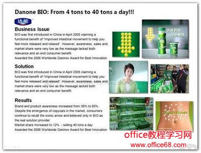 页面保留了商务PPT的特性,规规矩矩。3张图分别对应图上3条内容信息。但排版的问题,使得图片与内容 缺乏呼应,页面大有“为了放图而放图”的感觉,缺乏指向性。 优化后(After)