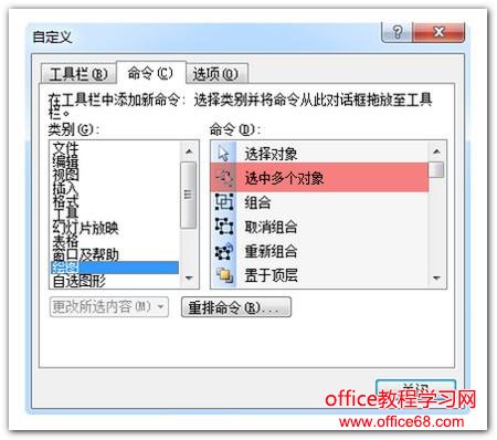 在PowerPoint 2003版本里没有真正意义上像PowerPoint 2007/2010里即刻可视化的选择窗格,但其实也有一个类似的功能——选择多个对象,他就是选择窗格的前身,就连他们的图标都极为相似。很多朋友可能又有话说了:为什么我没有看到呢?其实他是需要调用出来的。 操作如下:工具——自定义——命令——绘图——选中多个对象,鼠标单击“选中多个对象”不放并拖动其到工具栏后选择一个位置松开鼠标即可使用。