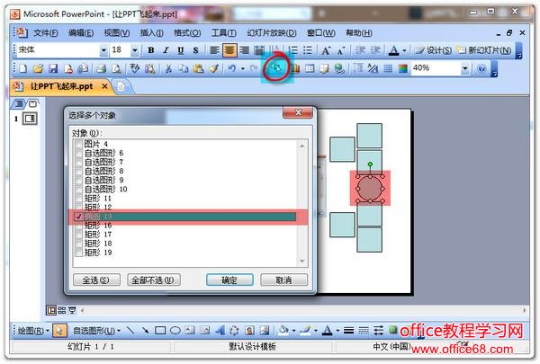 效果显示:如下图PPT中有13个元素,目前选中的对象是“椭圆13”,确定后“椭圆13”将被选中。PowerPoint 2003中的这个“选中多个对象”功能除了不能即刻可视化外,还不能修改元素名称,建议大家升级到PowerPoint 2010版本。