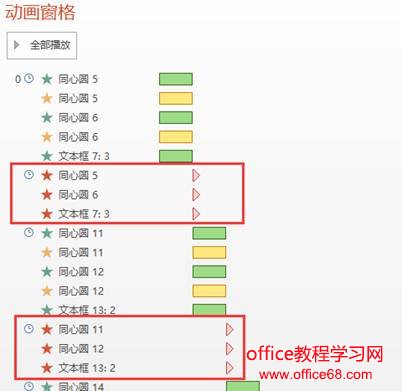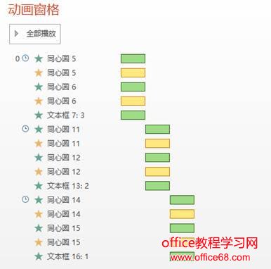 原来这里的做法是,借助了动画【效果选项】中的【播放动画后隐藏】这个设置。将动画窗格中的15个动画全选,一次性为它们设置好【播放动画后隐藏】即可。这样就可以轻松节省9个多余的动画设置了。