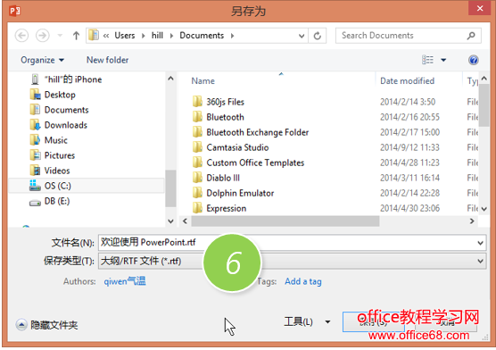 将保存类型改为“大纲/RTF文件”。(下图6处)