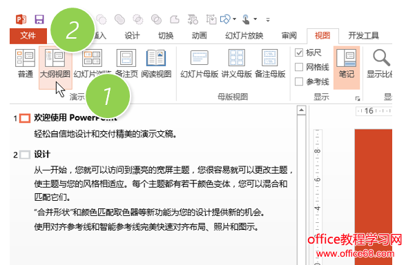 如果能把PPT的文字转成Word那该多好啊? 解答:当然可以,不过有前提,那就是PPT的文字一定是大纲模式。 具体方法如下:打开PPT,点击“视图—大纲视图”按钮,如果看到里面有文字,那么恭喜你,可以转成Word内容。(如下图1处) 接着点击“文件”按钮 (下图2处)