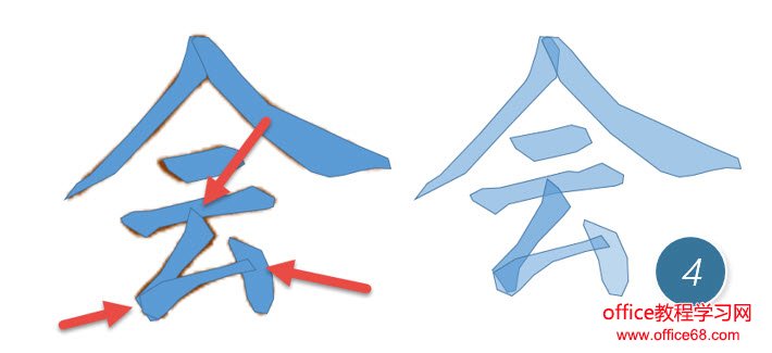 以此类推,在进行描边的时候,注意笔画之间的相互遮挡,注意下图左的红箭头所指的位置,如果看不明白,也可以看右边的透明笔画的表达,注意他们的重叠位置。(下图4处)