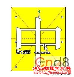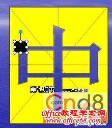 第二步:点击“绘图”工具栏中的“插入艺术字”工具,在打开的“艺术字库”对话框中选择第一行第一列艺术字样式,然后在“编辑艺术字文字”对话框中输入要演示的汉字“中”,并设置好字体。确定后,即可得到需要的空心汉字。选中后,利用控制句柄调节其大小,并将其位置拖到“米”字格的正中位置。如图1所示。选中“米”字格及艺术字,将它们组合为一个对象。