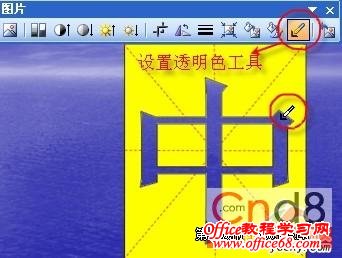 第四步:单击粘贴回的图片,显示“图片”工具栏,点击其中的“设置透明色”工具,然后单击汉字中空心的白色部分。这样,就可以得到一个透明的汉字了。如图3所示。(如果看不到“图片”工具栏,可以右击图片,在弹出的快捷菜单中选择“显示图片工具栏”命令)