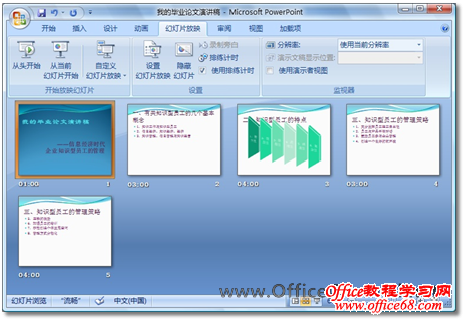 图4 清晰的时间分配方案,便于您从总体上掌握每张幻灯片的播放时长 (6)在“幻灯片放映”选项卡的“开始放映幻灯片”选项组中,单击【从头开始】按钮,按照常规方式播放幻灯片。这时,所有幻灯片都会按照您在练习时保存的时间进行播放,您可以借助已保存的最佳演讲时间分配方案再次进行演练,直至成为演讲时间控制的专家。 提示:虽然PowerPoint 2007已经为您记录了演讲的时间分配方案,但您同样有机会选择关闭它,位于【排练计时】按钮下方的“使用排练计时”复选框就是这样一个开关选项。 |