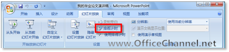 无论您是一位兢兢业业的教师、力求产品知名度的营销专家,还是要向答辩评审老师展现自己论文观点的学生,或者任何一位要去向很多人推销自己观点的演讲者,您都需要精心制作一份缤纷夺目的演示文稿,并凭借它使自己的演讲更具有说服力。 虽然Microsoft Office PowerPoint 2007可以帮助您轻松打造各种漂亮的演示文稿,但是,如果没有充分地准备演讲过程的每个细节,您在面对如此之多的听众时,心理可能并不那么轻松。所以,演讲前的排演工作尤为重要,要成为一位成功的演讲者,不可或缺的能力就是对演讲时间的掌控。演讲时间过长,会显得不专业;演讲时间过短,会显得内容贫乏。值得振奋人心的是,PowerPoint 2007就为您提供了这么一种练习控制演讲时间的功能,相信它对您演讲的成功会非常有帮助。 (1)保持您精心制作的PowerPoint演示文稿处于打开状态,在PowerPoint 2007的功能区中,切换到“幻灯片放映”选项卡,您就会在“设置”选项组中看到【排练计时】按钮,如图1所示。