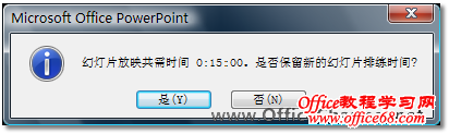 图3 提醒您保存已为每张幻灯片分配的播放时间 (5)单击【是】按钮,返回PowerPoint幻灯片浏览视图,这里清晰地记录了您在演讲每张幻灯片时所使用的时间长度,如图4所示。