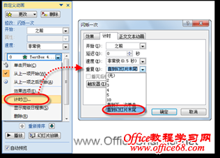 图7 修改动画的“重复”模式 (9)最后单击【确定】按钮关闭对话框。放映幻灯片,即可观看到文本变色效果。 |
