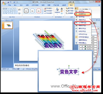 图5 粘贴多个颜色不同的文本框 (7)选中全部文本框,在“绘图工具”下的“格式”上下文选项卡的“排列”选项组中,单击【对齐】按钮,分别执行【左右居中】和【上下居中】命令,将所有文本框放置在同一位置上,如图6所示。