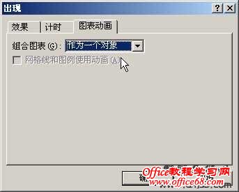 最后使用“图表动画”选项卡,在“组合图表”右边的下拉列表中选择“作为一个对象”。如图。单击“确定”关闭对话框。