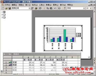 双击图表进入图表编辑区设置东部&北部的比较播放,在图表中删除西部和南部序列的数据,用鼠标左键在图表编辑区外单击,返回幻灯片编辑视图。