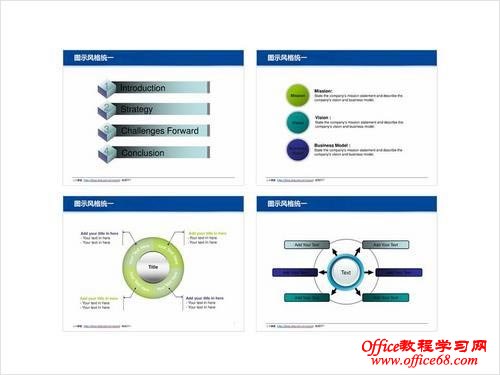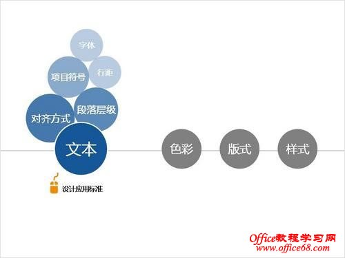 所谓样式即图示的风格,比如立体,平面,阴影,圆角,方角,渐变填充等等。网络海选的模板,风格样式各不相同,独立的看很“漂亮”,拼凑在一起“不伦不类”,显得“不够专业”再有图示拷贝过程中,色彩会适应当前PPT模板的配色方案啊,通常情况很少再去修改,所以导致深色填充背景上又使用黑色的字体,浅色背景上使用白色的字体,观众很难识别。 因此,开始做一个有效的改变尝试,规范设计你的PPT文档吧!