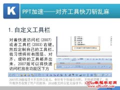 PPT中文字的对齐、图片的对齐,是做PPT最基本的要求了,也是PPT设计者最基本的能力。但你是不是还在用肉眼辨别PPT中文字或者图片是否对齐?是否还拿着尺子对着屏幕量对齐?不要再闹笑话了,专业PPT设计师都是用PowerPoint自带的工具对齐的。PPT图片或文字怎样对齐?下面一一来告诉你。 自定义工具栏横向或者纵向分布 对着...