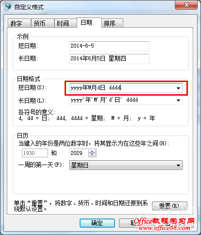 ![]() ![]() ![]() 2、进入到“自定义格式”,因为windows系统右下角显示的是短日期,所以在“短日期”里改就可以了。按照自己喜欢的格式,以笔者为例,格式设置为“yyyy-M-d dddd”。其中,yyyy代表了年,M代表了月,d代表了日,dddd代表了星期。设置完成后,点击确定就可以了。