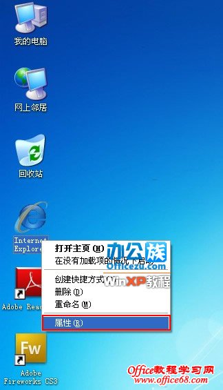 1 右键点击桌面上的“Internet Explorer”选“属性”。