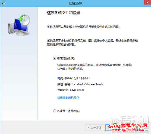 (2)如果你确切知道系统发生故障的时间,你可以点击“选择另一个还原点”,还原到时间更早的还原点去。选中一个还原点然后点击【下一步】然后点击【完成】就会开始还原了。