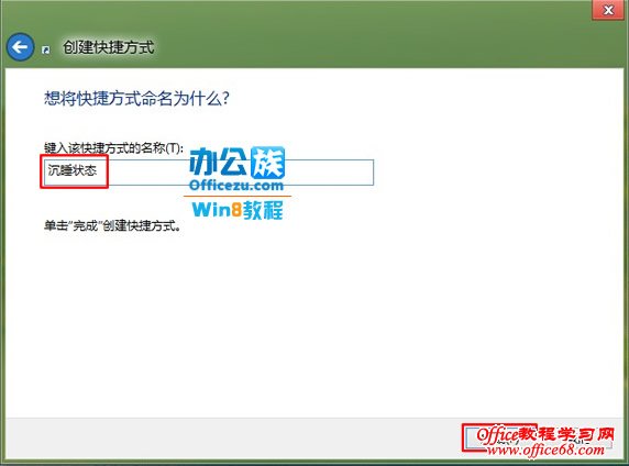 3 在将“键入快捷方式的名称”命名为“沉睡状态”或是其他名称用户可自行命名。