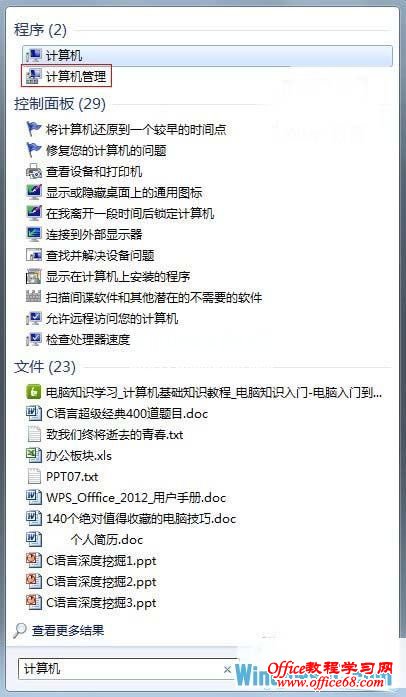 Windows7系统也默认开启了一些共享文件夹,这些文件夹对于电脑菜鸟来说,根本不知道是不是开启的,而且你也找不到在哪,下面,教大家一个查看计算机中共享文件夹的方法以便大家可以随心所欲地关闭Win7默认共享功能。 操作步骤 1、 单击开始按钮,在搜索栏输入计算机3个字,然后点击计算机管理。