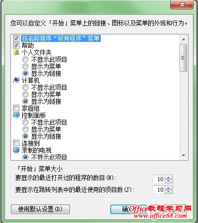 比如我们可以选择“计算机”按钮的显示方式,也可以对开始菜单的大小进行修改,大家可以自行尝试,这里就不再赘述了。有时经过一阵修饰可能我们又想恢复开始菜单的本来面目,此时单击“使用默认设置”即可将菜单恢复到默认值。