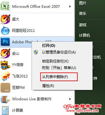 在使用win7的过程中,系统会自动按使用频次在开始在开始菜单中列出最近经常访问应用程序。这样大大方便了我们日常生活,但是着同样带来一个 问题,很多时候我们并不希望系统对个别程序进行记忆,此时我们可以在不想保留的应用程序名称上单击鼠标右键,在弹出的下拉列表中选择“从列表中删除”这样 系统就将当前应用程序从列表中删除了。