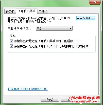 我们单击菜单属性中的“开始”菜单”选项卡,这里我们可以看到“隐私”选项组中就有关于是否存储最近应用程序和项目的选项,大家可以根据自己的实际情况自行设定。