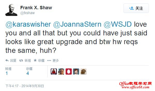 图为微软高管Frank Shaw的推文。华尔街日报曾发文称“不要购买Windows8设备,请等Windows10”,而这条推正是Frank Shaw的回应。显然 Frank Shaw认为这篇文章太过愚蠢,并称两代操作系统最低硬件要求相同。 我们来回顾一下Windows8.1的最低硬件要求: 处理器:1 GHz(或更高),支持PAE,NX,SSE2 RAM:1 GB(32位)2 G(64位) 硬盘空间:18 GB(32位)20 GB(64位) 显卡:DirectX 9 显卡带有 WDDM 1.0或以上的驱动
