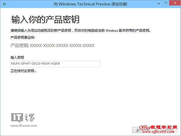然后输入微软公开的技术预览版密钥:NKJFK-GPHP7-G8C3J-P6JXR-HQRJR,密钥验证成功后下一步即可。