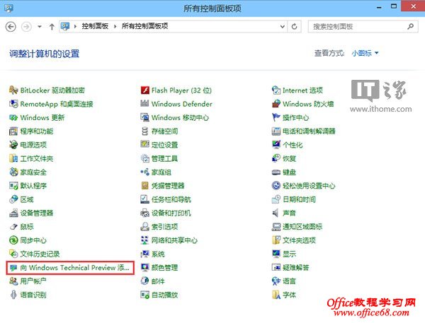 打开控制面板(以小图标方式查看),找到并打开“向Windows Technical Preview for Consumer添加功能”。