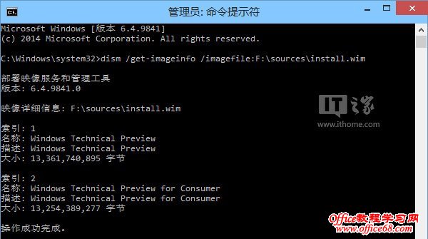 这是因为微软放出的Windows10技 术预览版镜像内实际上包含两个版本:技术预览版(Windows Technical Preview)和消费者技术预览版(Windows Technical Preview for Consumer),而微软公开的密钥是适用于技术预览版的。下图所示为利用Dism映像部署和管理工具查看到的版本信息。