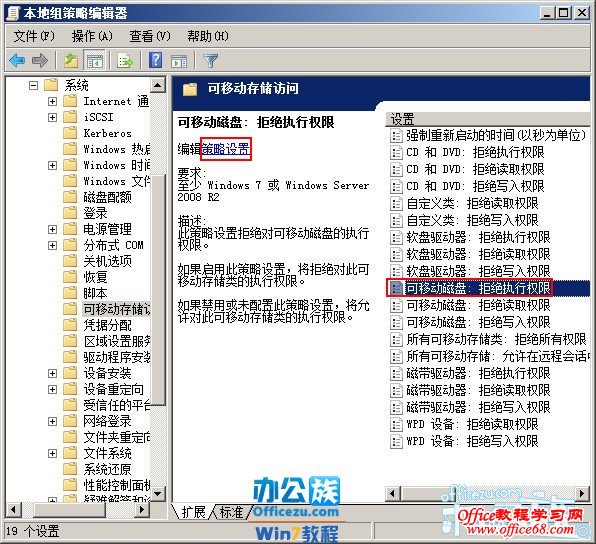 4 进入“可移动存储访问”选中“可移动磁盘:拒绝执行权限”,再点击“策略设置”。