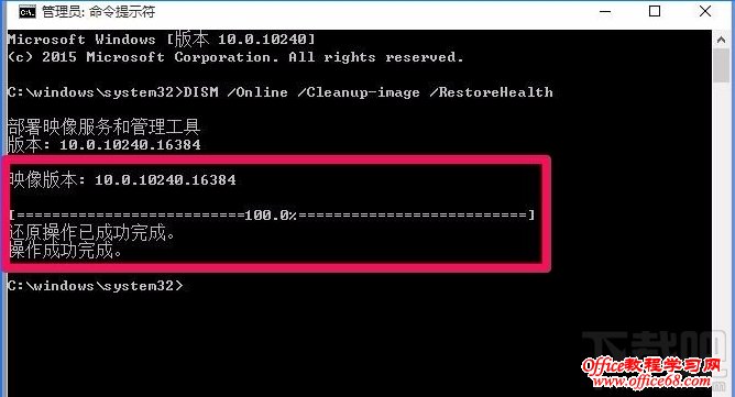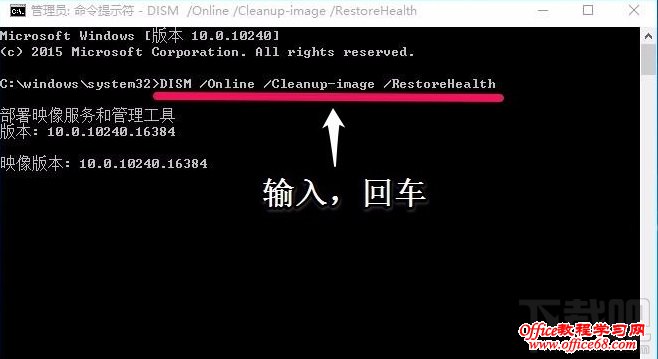 在管理员命令提示符窗口输入DISM /Online /Cleanup-image /RestoreHealth命令并回车,把系统映像文件中与官方文件不相同的文件还原成官方系统的源文件。