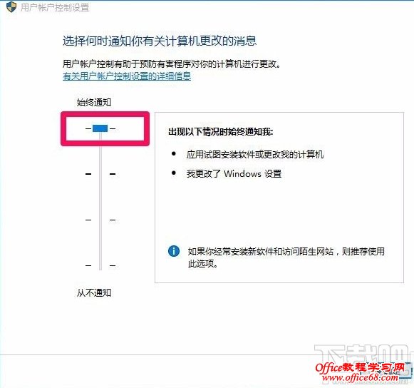 3.在用户帐户控制设置窗口,我们可以看到调整通知的小滑块处于“始终通知”位置;