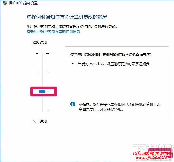 4.再把小滑块拖到如下图位置:仅当应用尝试更改我的计算机时通知我(不降低桌面亮度)- 当我对Windows设置进行更改时不要通知我,再点击确定;