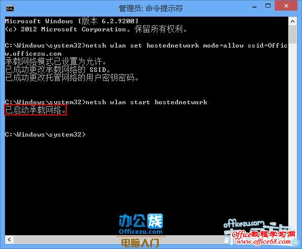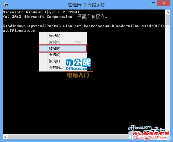 2 打开“管理员:命令提示符”输入“netsh wlan set hostednetwork mode=allow ssid=OfficeZu key=www.officezu.com”。(ssid=XX key=XX用户可以自行填写名称和密码)