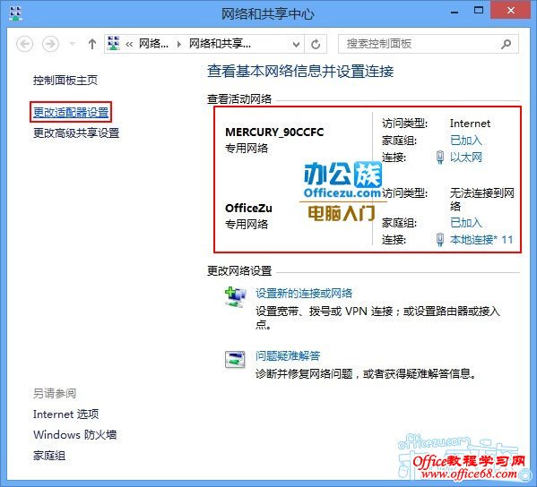 7 此时打开“网络和共享中心”单击“更改适配器设置”。