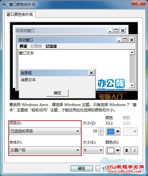 6 此时打开“窗口颜色和外观”,用户可清楚看到“项目(I)”。