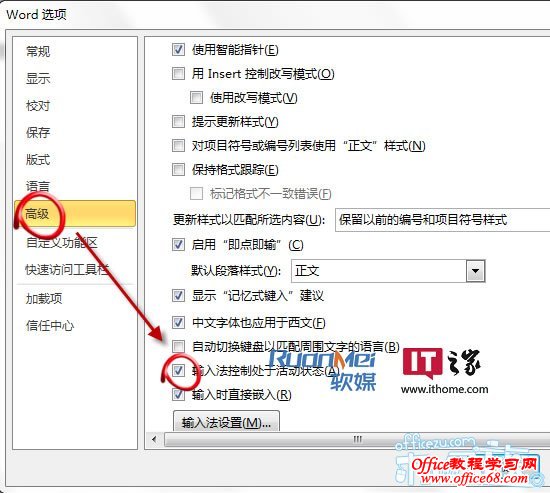 2 在“选项”窗口,单击“高级”,然后从右侧细节窗口找到“输入法控制处于活动状态”,将其勾选。