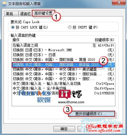5 弹出“文本服务和输入语言”窗口后,切换到“高级键设置”选项卡。选中一项操作(如语言切换或全半角切换),然后单击“更改按键顺序”按钮进入自定义窗口。