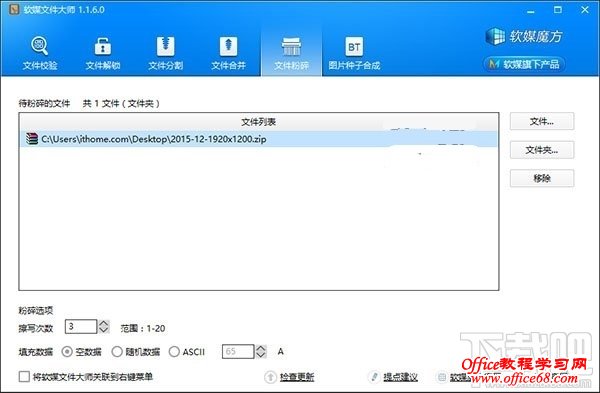 最后的字母“C”代表分区盘符,根据需要修改即可。之后只需要耐心等待,如下图所示: 为擦除数据,该工具会依次执行三个任务:首先,用0x00覆盖剩余空间,然后用数据0xFF覆盖剩余空间,最后再使用随机数据进行擦写。完成整个过程需要一些时间,取决于硬盘剩余空间大小。 是不是非常简单?另外,如果你的文件还没有被人为删除,可使用软媒魔方中的文件大师对其进行粉碎,文件大师同样会使用随机、空白等数据对文件进行擦写,这在需要对于单个文件进行擦除时效率要更高。如下图所示: